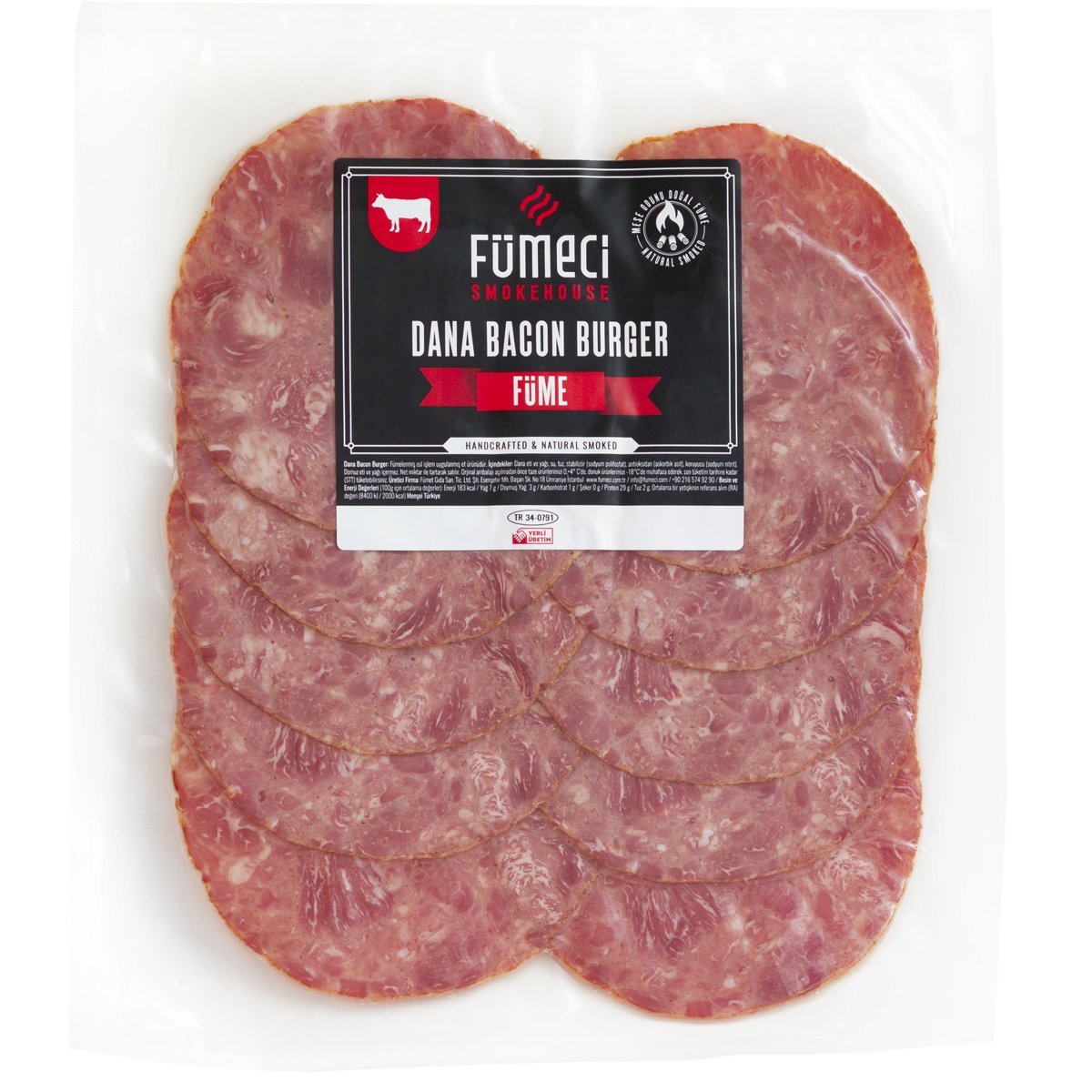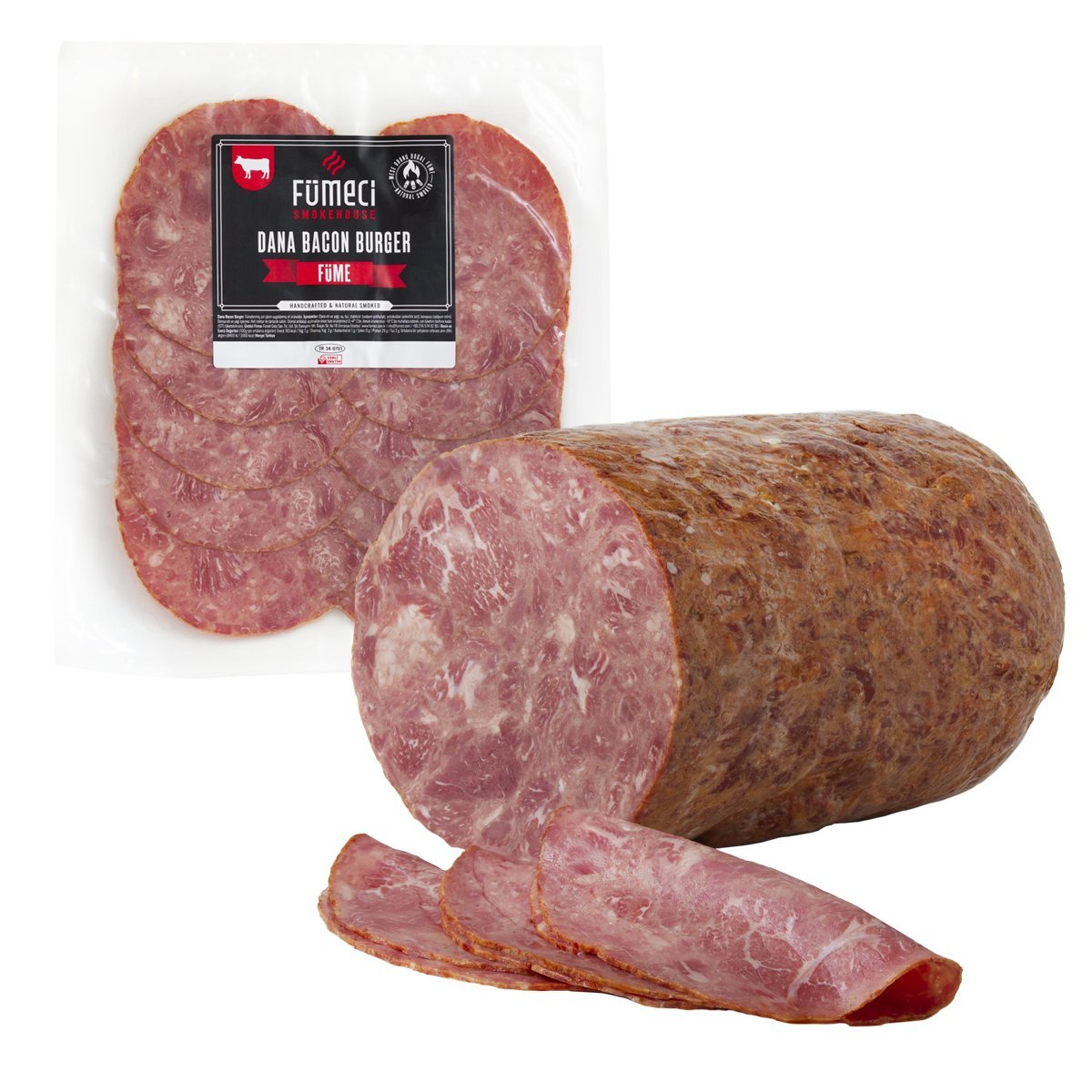 Fümeci Smokehouse’un herkesçe sevilen ürünü Dana Bacon özel deniz tuzu ile masajlanan etten yapılmaktadır. Özel olarak hazırlanan ve masajlanan et, dinlendirilmekte ve tütsüleme işlemine hazır hale getirilmektedir. İki farklı pişirme yöntemi ile yaklaşık olarak on saat fırınlanan dana eti, tütsüleme işleminden geçirilmekte ve bir gün dinlendirilerek daha lezzetli olması sağlanmaktadır. Etin lezzetli olması için tütsülemede kullanılan ağaçlara dahi özen gösteren firmamız, gürgen, meşe ve kiraz ağaçlarından elde edilen doğal odunların dumanı ile eti tütsüler. Fümeci Dana Bacon, lezzetine doyamayacağınız, günün her saatinde tüketmek isteyeceğiniz eşsiz ve baş döndürücü bir lezzettir. Farklı gramajları ile sizlerin beğenisine ve takdirine sunulur.