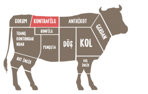 Fümeci SmokeHouse Dana kontrfile dananın sırt kısmından elde edilen yumuşak bir et çeşidi olarak sizlere servis edilir. Kontrfile, dananın sırtında, kuyruk kısmına yakın bulunan bir kastır. Oldukça lezzetli bir bölgedir. Bonfile ve kontrfile aynı kemiğin iki yanındaki kıymetli etler olarak bilinir. Bir diğer adı biftektir. Kontrfile, lezzetli ve kemiksiz bir ettir. Fümeci SmokeHouse Dana kontrfile yumuşak bir et türü olarak kolaylıkla yenilebilir. Siz değerli Fümeci SmokeHouse severlere sunulan Kasap ürünlerimiz içerisindeki yerini almış ve çok sevilmiştir.