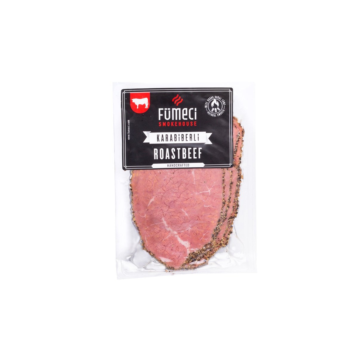 İki farklı pişirme yöntemi ile yaklaşık olarak on saat fırınlanan kekikli roast beef, tütsüleme işleminden geçirilmekte ve daha lezzetli olması sağlanmaktadır. Etin lezzetli olması için tütsülemede kullanılan ağaçlara dahi özen gösteren firmamız, gürgen, meşe ve kiraz ağaçlarından elde edilen doğal odunların dumanı ile eti tütsüler. Fümeci Karabiberli Roast Beef füme, karabiberin tüm lezzetini içine çeken, lezzetine doyamayacağınız, günün her saatinde tüketmek isteyeceğiniz eşsiz ve baş döndürücü bir lezzettir. Farklı gramajları ile sizlerin beğenisine ve takdirine sunulur.